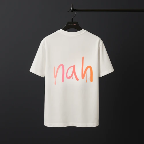 "Make a bold statement with the 'NAH' drop shoulder graphic t-shirt for men. Featuring a vibrant design in pink and orange, this relaxed fit t-shirt adds a fun, expressive vibe to your casual wardrobe. Available in multiple sizes."