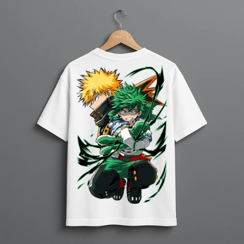 Power up your wardrobe with this striking Deku and Bakugo graphic drop-shoulder t-shirt from My Hero Academia. Perfect for anime lovers in Bangladesh, this shirt offers comfort and showcases your favorite heroes.