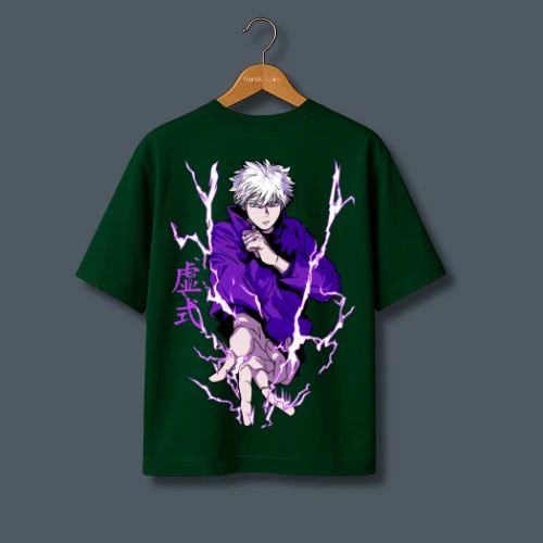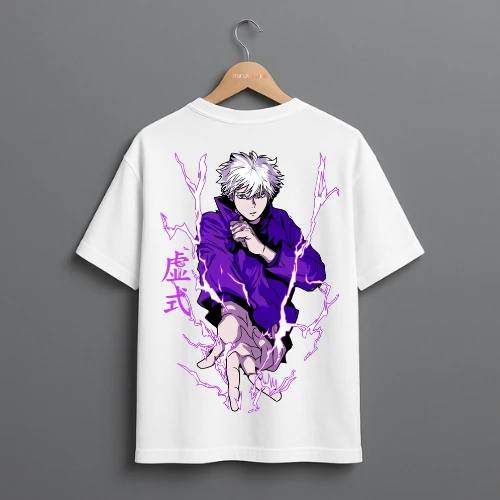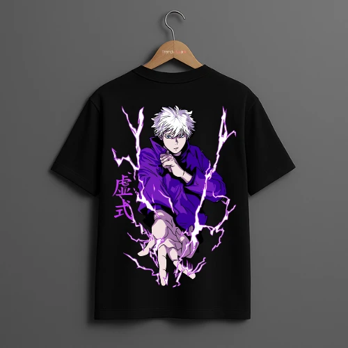 Unleash the energy of Satoru Gojo with this stunning purple lightning drop shoulder t-shirt for men. The electrifying design showcases Gojo in action, making it a must-have for Jujutsu Kaisen fans and those looking to make a bold fashion statement.